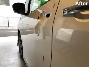 かなり大きい凹みでしたが、綺麗に直せると判断し施工いたしました。