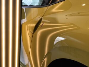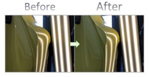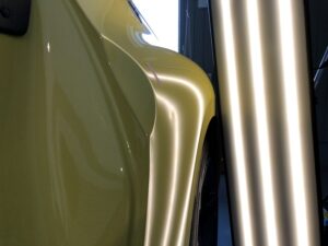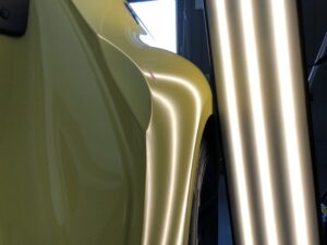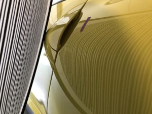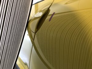 このような鋭いヘコミや、ボディラインにかかる難しいヘコミであっても、塗装の状態などの条件さえクリアできれば、違和感なく完全に復元することが可能です。