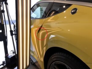 鮮やかなイカズチイエローが目を引く素晴らしいお車ですが、リアフェンダー(クォーターパネル)のヘコミのご相談です。